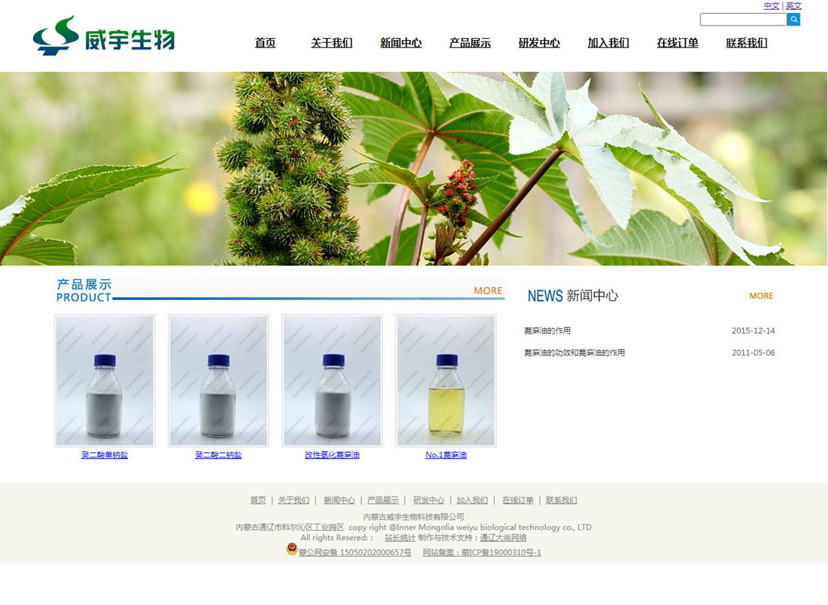 內(nèi)蒙古威宇生物科技有限公司,成立于2012年,注冊(cè)資金1500萬(wàn)元,位于通遼市科爾沁區(qū)工業(yè)園區(qū),企業(yè)占地面積72384平方米,是一家以蓖麻籽為基礎(chǔ)原料,集科研、生產(chǎn)、銷(xiāo)售于一體的高新技術(shù)企業(yè)。